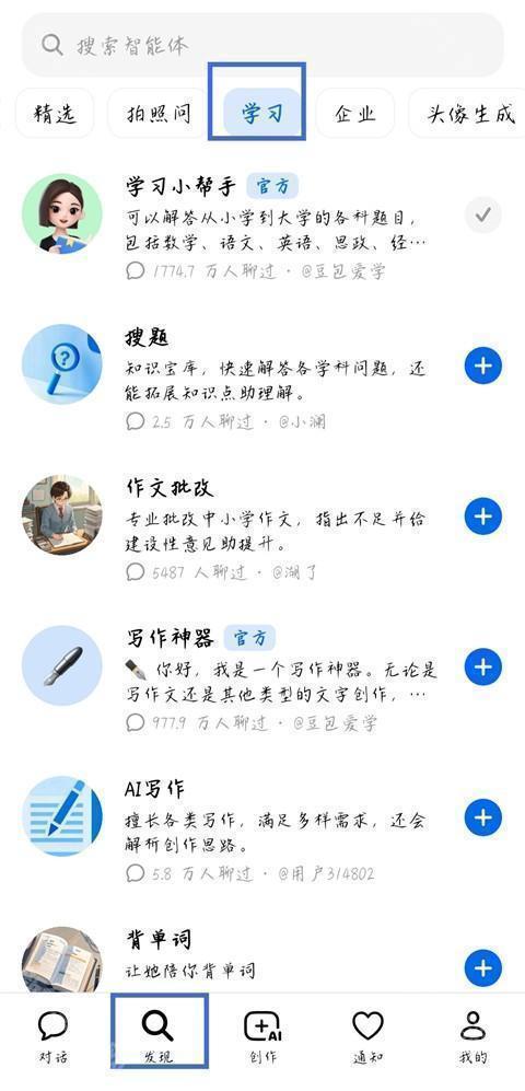 1、打开豆包ai,进入【发现】页面,点击【学习】。