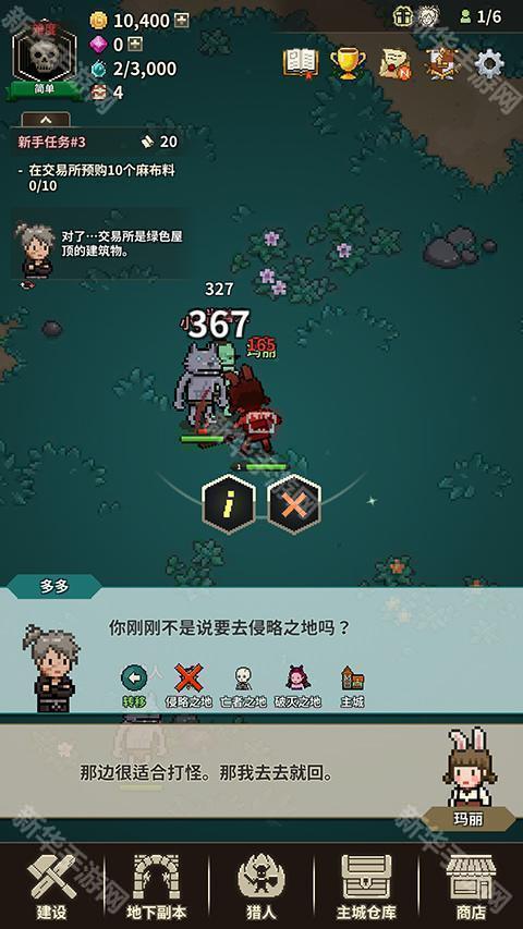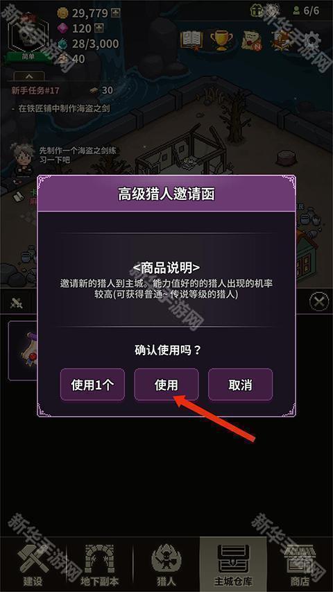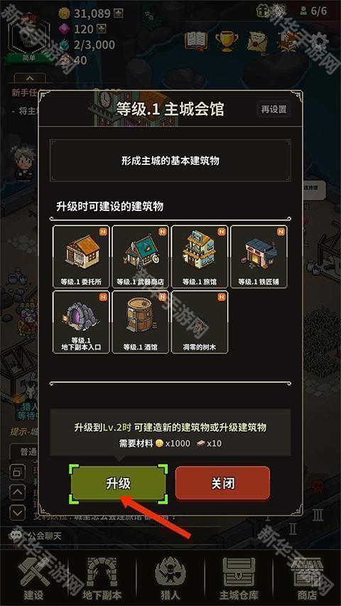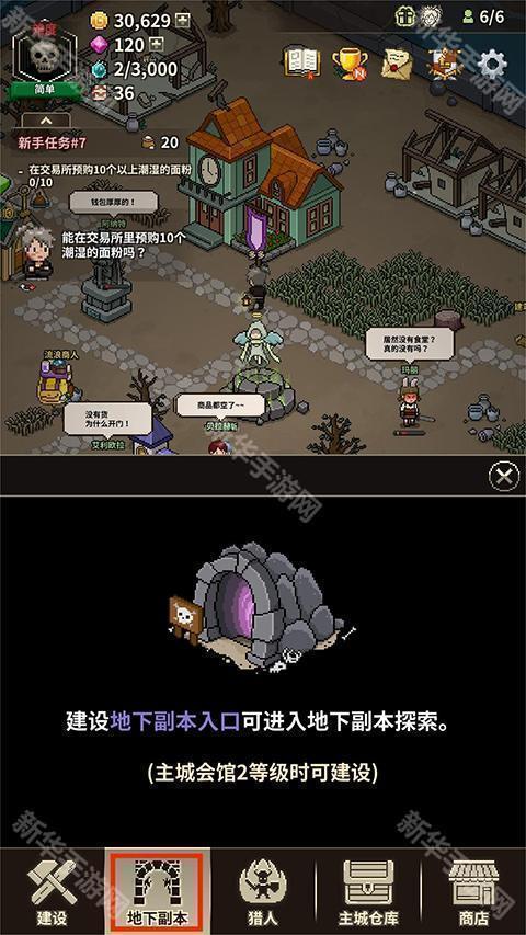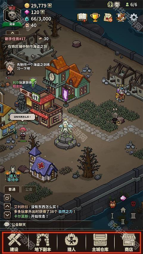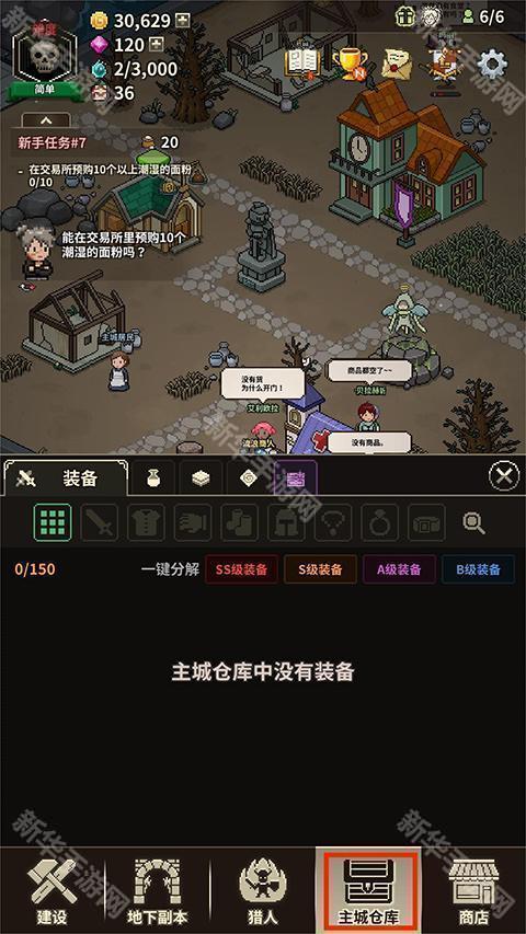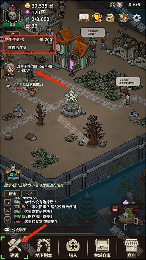 1、打开猎魔村物语游戏,进入游戏主界面,在下方包括【建设】、【地下副本】、【猎人】、【主城仓库】和【商店】选单,