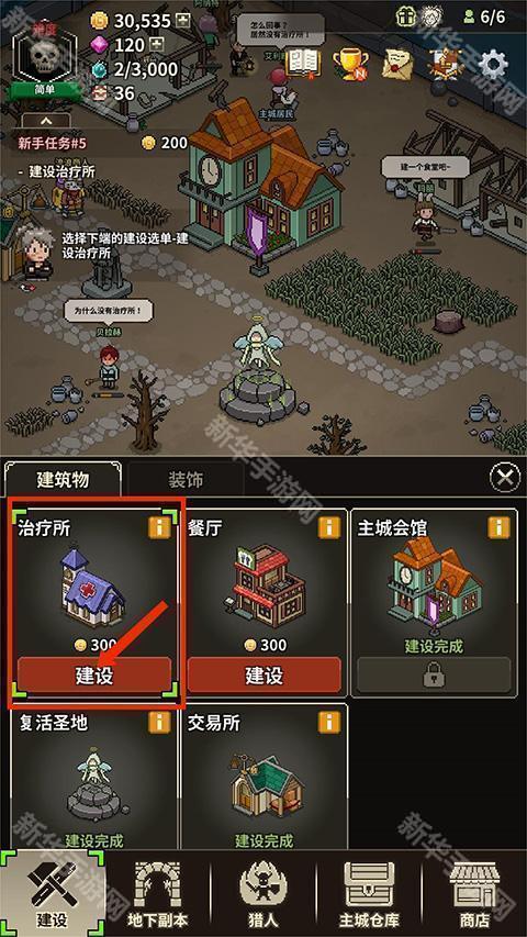 2、点击【小人物】图标,可看到任务要求,选择建设选单,建设治疗所,
