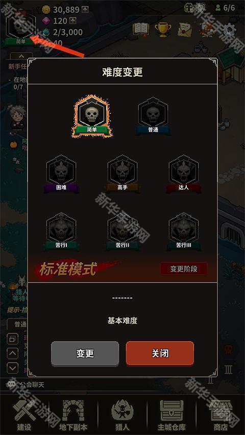 13、选择左上方【骷髅头】图标,可切换游戏的难度,包括简单、普通、困难、高手、达人、苦刑等程度,