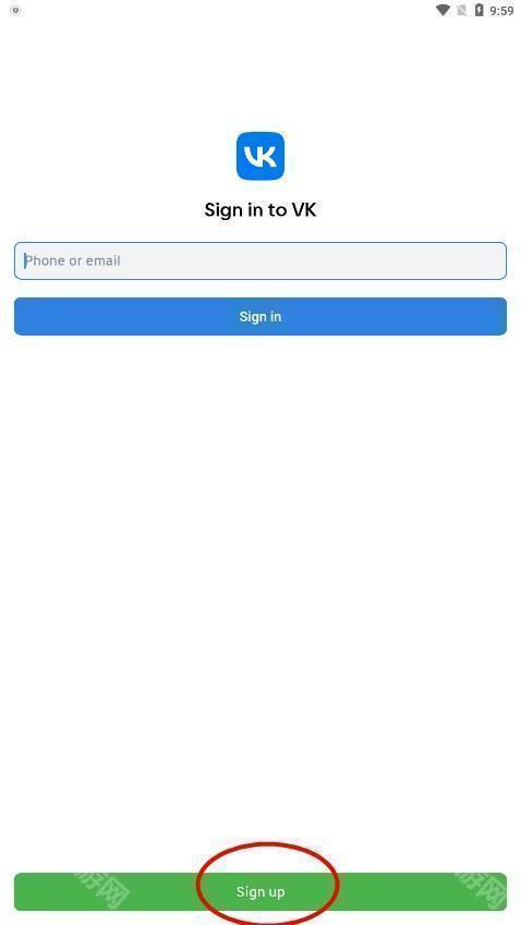 2、打开VK app,进入登录界面,点击下方“Sign up”选项