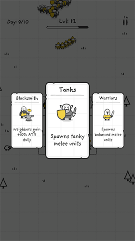 1.从三张升级卡中选择,以增强属性、解锁能力或为你的军队添加新兵种。
