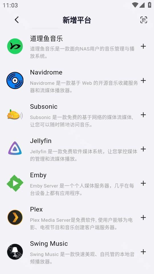 2、在弹出的平台列表中,找到道理鱼音乐,点击其右侧的“+”号进行添加。