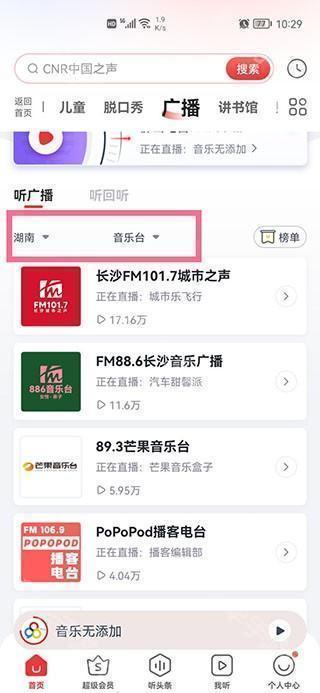 2、选择地区和广播类型即可跳转到想听的频率。