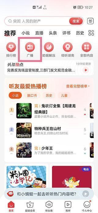 1、打开蜻蜓fm,点击首页的【广播】。