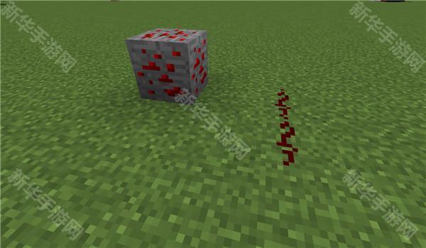 如图所示,左边的矿物是红石矿,开采后可以获得数个红石,红石放置在地上之后就会形成红石线路。要注意的是,红石矿在开采的时候会出现自然发亮现象,不必惊慌,我们开采红石矿的工具至少为铁质的。