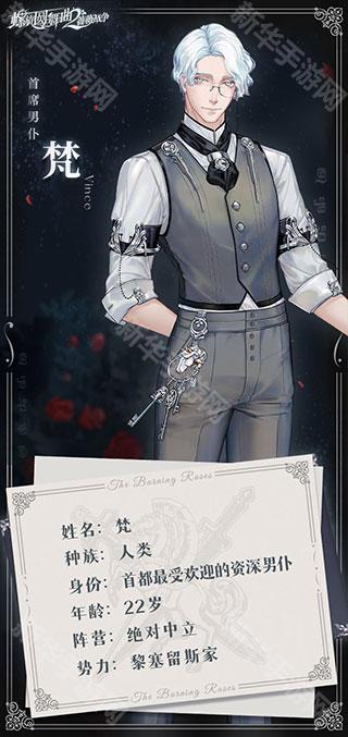 来自奥斯兰的梵现在是黎塞留斯家的首席男仆。小到女士的鞋扣掉了该如何处理,大到女王寿辰宴席该如何操办,他样样精通。有他在的舞会,你不需要担心任何事,只管享受就行了,而他永远笑脸迎人,永远准备好为你服务。