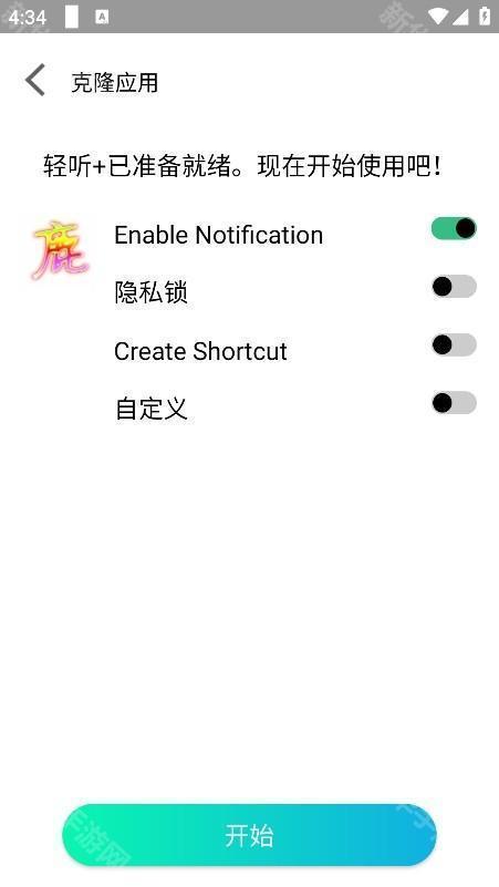 3、用户们可以自定义选择是否需要开启通知、隐私锁、创建快捷方式等选项内容,然后点击开始;