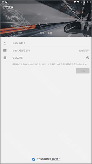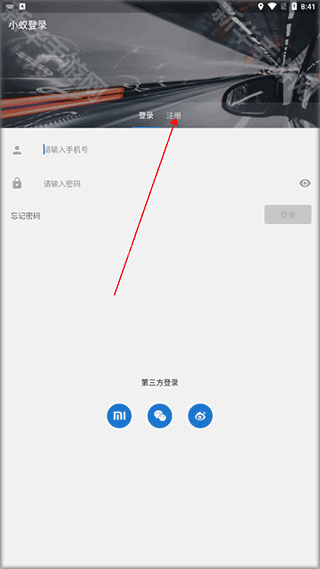 1、下载安装好小蚁行车助手安卓版,点击如图所示,进行注册。
