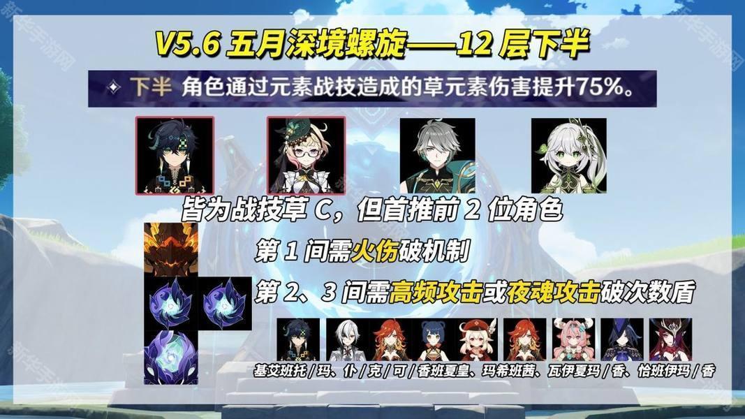 原神5.6深渊螺旋12层下半怎么打?原神5.6深渊螺旋12层下半的buff机制是草元素伤害提升,我们可以根据这个加成去选择草属性C和辅助去配队打下半关卡。有很多小伙伴不知道5.6深渊螺旋12层下半怎么打,接下来就和小编一起来看看原神5.6深渊螺旋12层下半满星攻略吧。