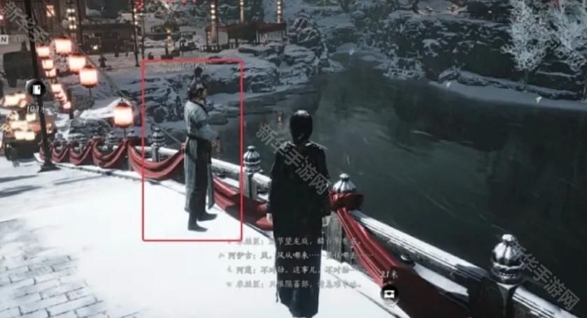 4、最后前往酒泉镇的桥上(图中位置),把旧马鞍交给阿莲或者阿伊古,即可完成万事知任务:风之所向