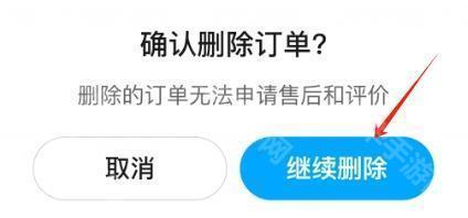 4、点击滑动后右侧出现【删除】选项,在弹出的对话框中选择【继续删除】,即可删除此订单记录