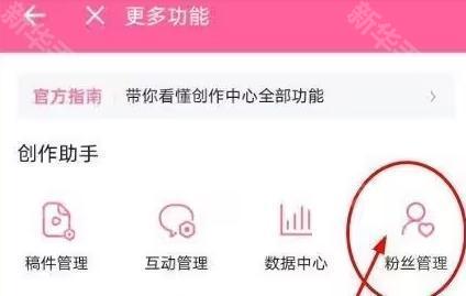 3、在【更多功能】的页面,点击【创作助手】-【粉丝管理】选项