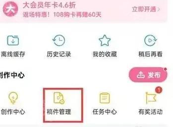 2、在个人主页的【创作中心】,点击【稿件管理】选项