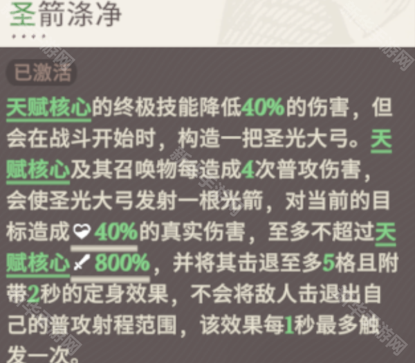 天赋核心每造成4次普攻伤害(完全体两次)就可以召唤一根光箭造成最高800%攻击力的真实伤害,数值还是比较优秀的。
