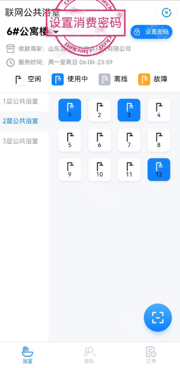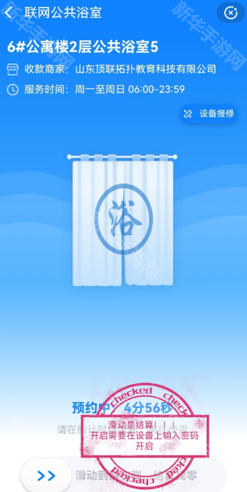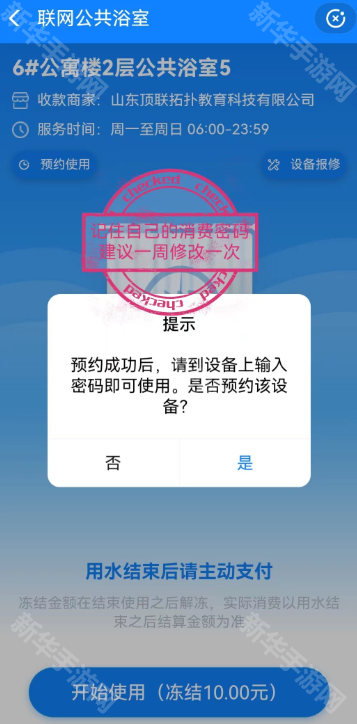 3、预约后软件会为我们保留5分钟,之后前往浴室并输入消费密码即可进行使用