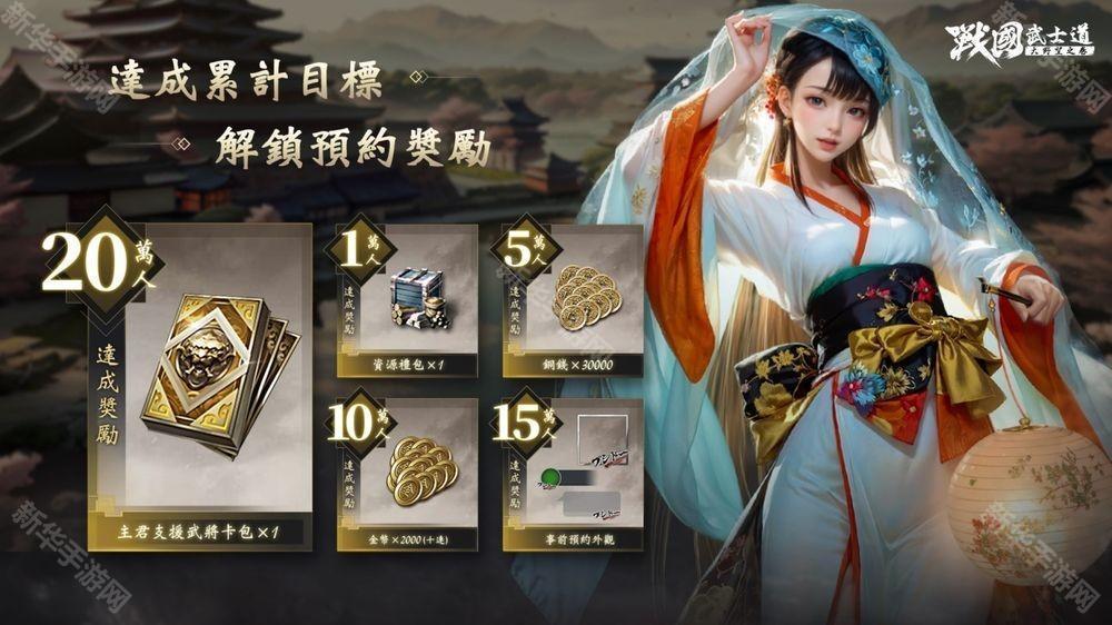 依事前预约人数不同,奖励也会随之升级!若突破 10 万人,所有玩家将可获得十连抽的金币;若突破 20 万人,则可获得内含强力战国武将的特别卡包!快邀请身边的战友一起来预约吧!