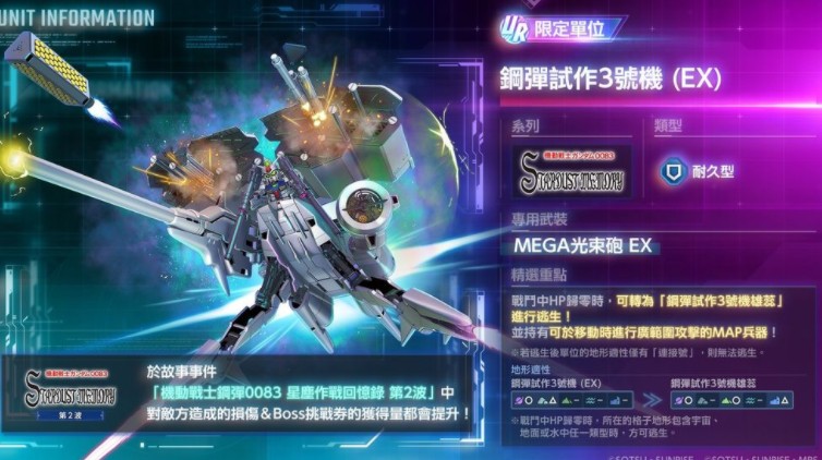 Bandai Namco Entertainment Inc. 旗下 App Store、Google Play 专用智慧型手机游戏《SD 钢弹 G 世代 永恒》宣布,现已公开 10/10 (JST) 新单位登场预告,包含 UR「钢弹试作 3 号机 (EX)」、UR「诺耶·吉尔 (EX)」即将登场。