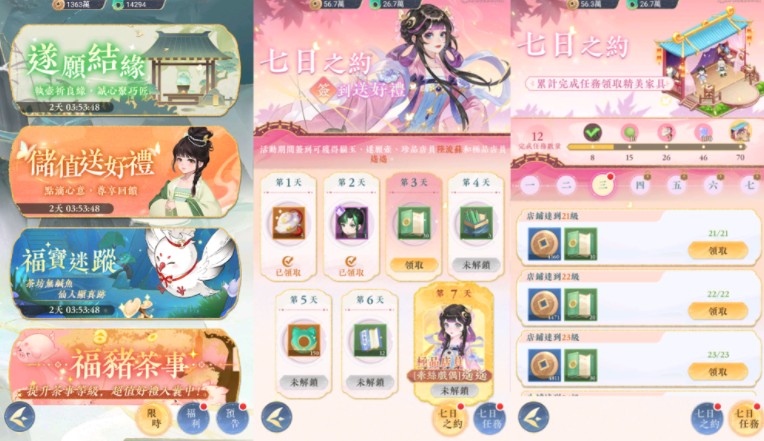 游戏于今日上线,除了可以领取到事前预约福利的晋升简书 X100、猫玉 X100、遂愿壶 X3 和限定头像框 X1 外,还有 7 日登入领取极品店员遥遥和珍品店员陆流苏,以及各项资源奖励。遥遥能增加我方厨艺、增加客流量,自身也有高速移动技能,好应对不断进店的人潮,是初始不错的店员考量。玩家也可以透过七日之约的任务活动获得丰富资源,累积完成还能领取傀戏开幕的精美家俱。