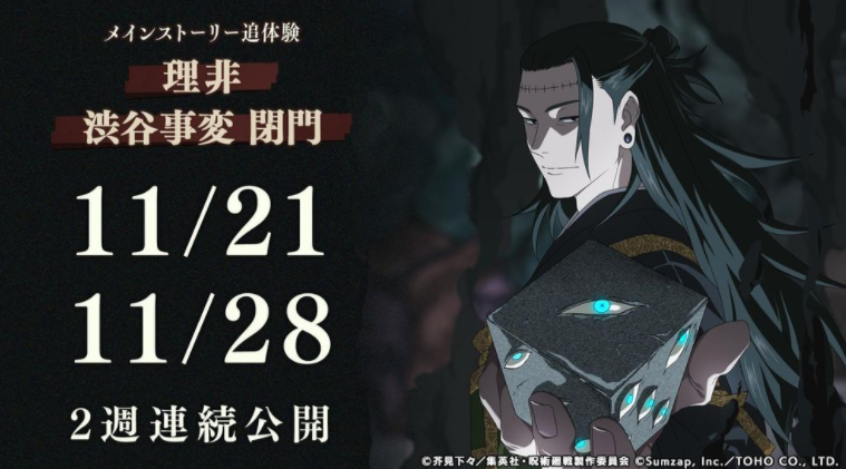 2025 年 11 月 21 日(五)、11 月 28 日(五)这两周,将连续公开主线故事「理非」、「涩谷事变 闭门」。配合主线故事,期间限定 SSR 角色 [最大输出咒力] 虎杖悠仁、[这样你就满足了吗?] 东堂葵、SSR 廻想残滓「无可取代的瞬间」将于转蛋登场,且抽取机率增加。另外,也将举办最多可免费入手 40 张转蛋券的活动。
