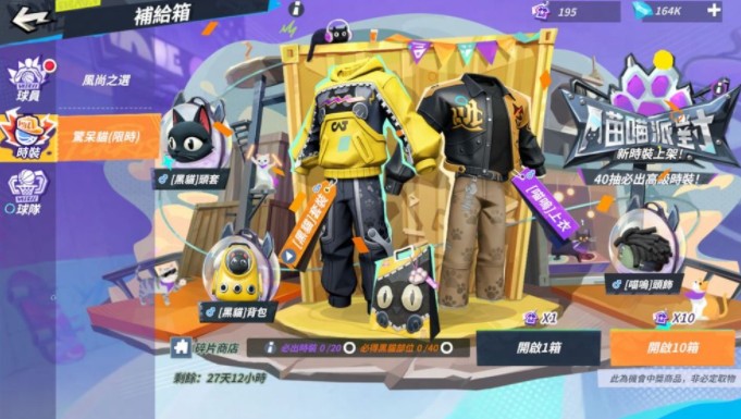 本期更新带来从可爱萌系到硬派战斗风的多款人气时装,满足街球手不同的造型需求。限时补给箱【喵喵派对】率先登场,高级时装【黑猫】与中级时装【喵呜】同步亮相:俏皮猫耳、可爱背包、潮流外套与细腻猫咪元素,让街球手化身球场最萌「喵系选手」,不论冷酷黑猫或亮黄喵呜造型,都能瞬间吸睛,赶紧把对手打得「咪咪猫猫」吧!