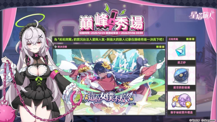 为「莉莉贝尔」的实况台注入爱与人气,与强大的旅人幻象在巅峰秀场一决高下。完成目标即可获得 [星之砂]、[星空的彩琉璃]、[新手祕纹晋升礼盒] 等奖励。