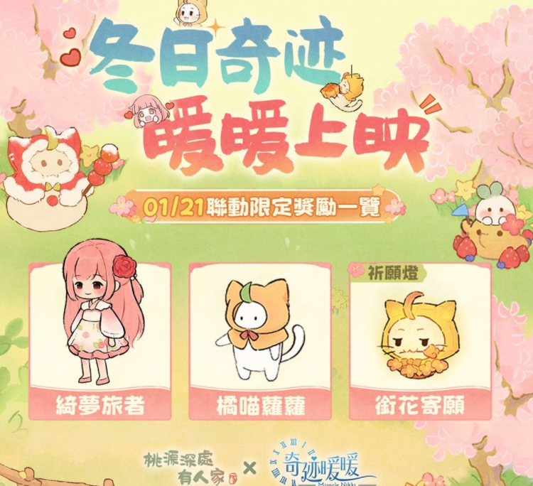 星宿科技今(21)日宣布,治愈系模拟经营手游《桃源深处有人家》携手人气 IP《奇迹暖暖》展开梦幻联动,游戏中的主角暖暖与大喵一同来到桃源,准备度过一个暖暖的冬天。官方指出,联动从今(21)日起正式开跑,开放限定「三秋梦合」合成玩法,只要透过游戏内分享就能获取同款陶陶幻型时装,参加活动玩法,还有 15 款不同礼物免费兑换,一起来暖暖过冬吧。