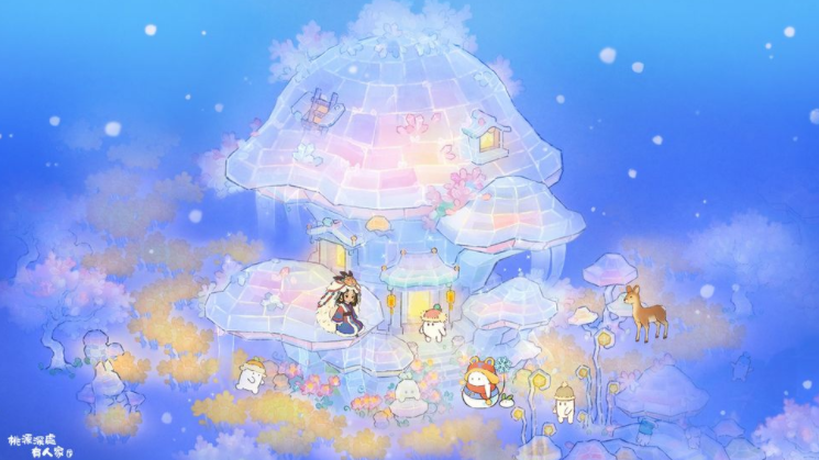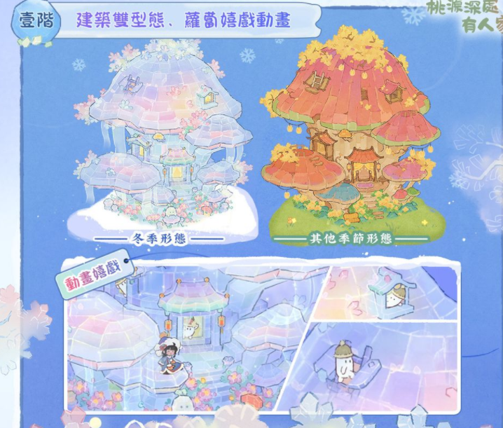 桃源首座「双型态建筑」—— 蘑菇城堡【蕈华釐苒】正式登场!此建筑在雪景之下是高冷梦幻的冰雪城堡样貌,但当萝萝山转换其他季节时,建筑也会随之转变为生机盎然的可爱蘑菇小屋,风格反差惊喜满满。